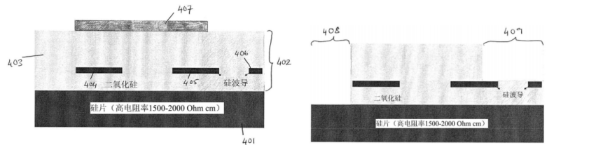 上图是制造光子集成电路的过程示意图,首先在硅衬底401上制造二氧化硅层403,其中二氧化硅层包封三个由硅形成的波导404-406(如a图所示),并在a图中的上表面生成了掩模407,而且掩模允许从无源层402选择性蚀刻二氧化硅。进而就得到了如b图所示的蚀刻之后的结构,并相应地产生了两个凹槽408、409。