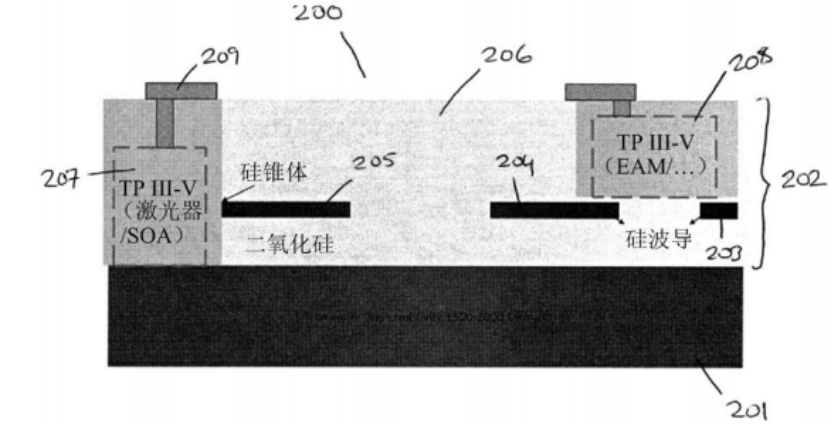 上图是该专利中一种光子集成电路的示例,从图中我们可以看到,光子集成电路200主要包括由高电阻率硅片形成的衬底201、由二氧化硅层206和三个硅波导203至205形成的无源层202,以及两个III-V族材料层207、208。