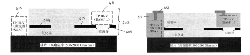 两个III-V族材料层分别位于无源层的相应凹槽中,其厚度为1μm至5μm之间。其中第一层207一般用作激光器,可以耦合到无源层202内的波导205上,这样一来激光器就能够把光传递到波导205中。而第二III-V族材料层208一般用作EAM,且以绝热方式耦合到无源层203内的波导204、203。在图1的示例中,所有的波导203至205均被二氧化硅覆层206所包围。另外,电重布线层(以互连209表示)与有源设备相接触,使得有源设备能够和电子集成电路中的电组件相连。