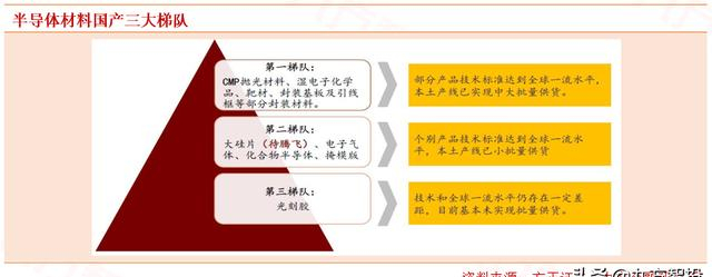 根据我国半导体材料细分产品竞争力及目前国产化进度,目前可以把中国半导体材料产业分为三大梯队。从目前的国产化进程来看:第一梯队>第二梯队>第三梯队。