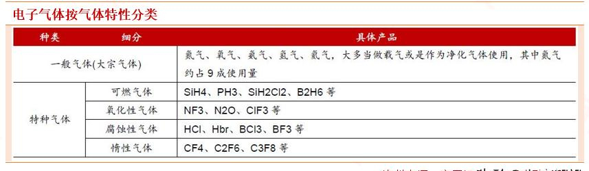 电子气体是指用于半导体及相关电子产品生产的特种气体,应用范围十分广泛。按其本身化学成分可分为:硅系、砷系、磷系、硼系、金属氢化物、卤化物和金属烃化物七类。按在集成电路中不同应用途径可分为掺杂用气体、外延用气体、离子注入气、发光二极管用气、刻蚀用气体、化学气相沉积气和平衡气。在半导体工业中应用的有110余种单元特种气体,其中常用的有超过30种。