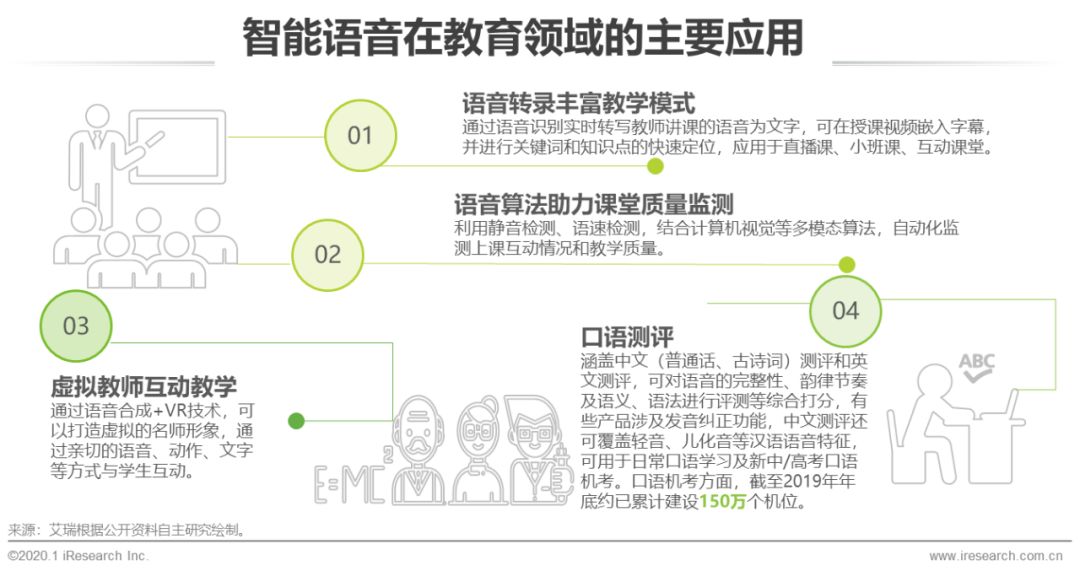 智能教育领域,AI课堂的建设进入快车道,强调两点:一是解决家校之间、线上线下之间学习资源互通的问题,二是通过多模态识别收集课堂学情信息并做数据精准分析,因此通过语音转录、语音识别等技术实现授课语音转录为文字、利用多模态识别进行课堂质量监测不可或缺。另一方面,在线教育竞争呈白热化态势,用技术解决教育资源的复用、增加学习交互体验感等诉求也促进了智能语音技术在线上口语测评、虚拟教师等领域的应用。考试赛道方面,北京、上海、江苏、广东等省市近年推行在新中考、新高考英语考试中以机考形式进行口语测试,因此人机对话技术和智能语音评测技术开始应用于考试场景,以提升口语考试的效率。