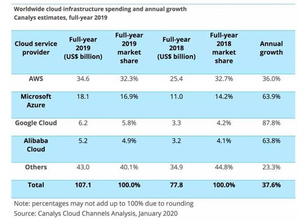 据Canalys发布的最新2019年全球云市场份额数据,亚马逊是目前全球最大的云服务商,市场份额达到32.3%;微软排名第二,市场份额为16.9%;谷歌第三,市场份额为5.8%;阿里云第四,市场份额为4.9%。