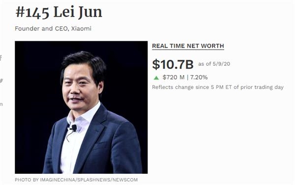 据福布斯实时全球富豪榜显示,截至5月9日,雷军的个人净资产达107亿美元(约合人民币757亿元),在全球排名第145位。