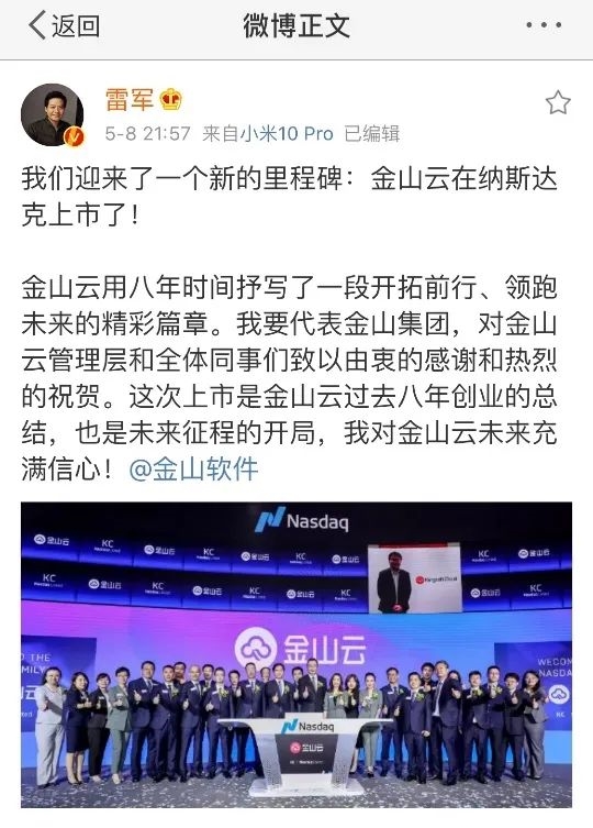 上市当天,雷军通过个人微博发文祝贺金山云上市,他写道:“金山云用八年时间抒写了一段开拓前行、领跑未来的精彩篇章。我要代表金山集团,对金山云管理层和全体同事们致以由衷的感谢和热烈的祝贺。”