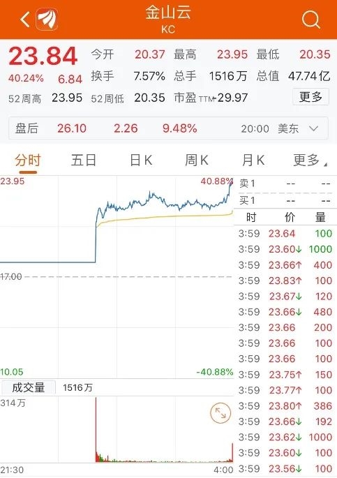 5月8日晚,金山云在美国纳斯达克上市,发行价为17美元,股票代码为“KC”,共募集资金5.1亿美元。上市首日,金山云股价涨超40%,市值近48亿美元。这也是继金山软件、小米和金山办公后,雷军的第4家控股上市公司。