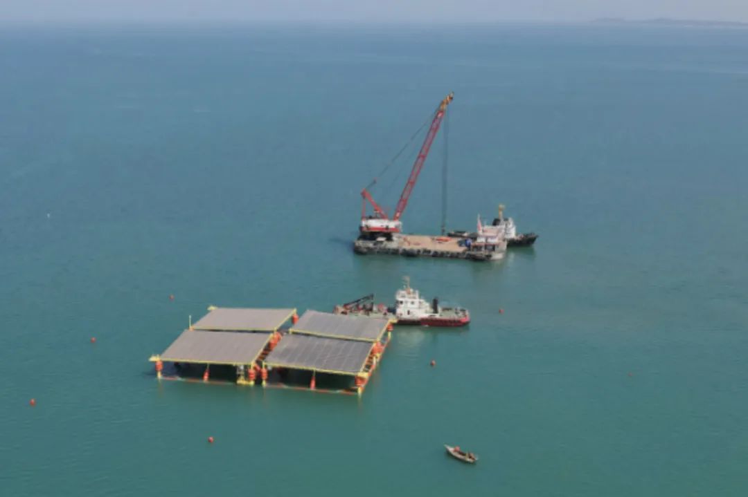 该项目位于山东烟台近海海域,漂浮式光伏试验平台由4个独立的浮体组成,总容量为400KW。该项目是国内首个采用锚系系泊系统的海上漂浮式光伏平台,也是国内首个半潜式漂浮式光伏平台。