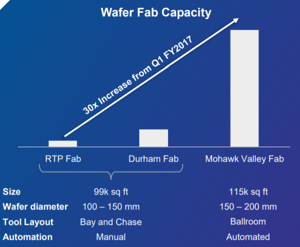 而在2019年上半年Cree所宣布的10亿美金大扩产中,GaN的外延(on SiC)和器件制造也是包含其中,目前其功率和RF产品主要还是在原来的工厂,而新增的扩产计划和新建工厂有望将wafer产能扩张至原来的30倍,晶圆尺寸也将从4-6寸扩展到6-8寸,并且生产效率还将显著提升。