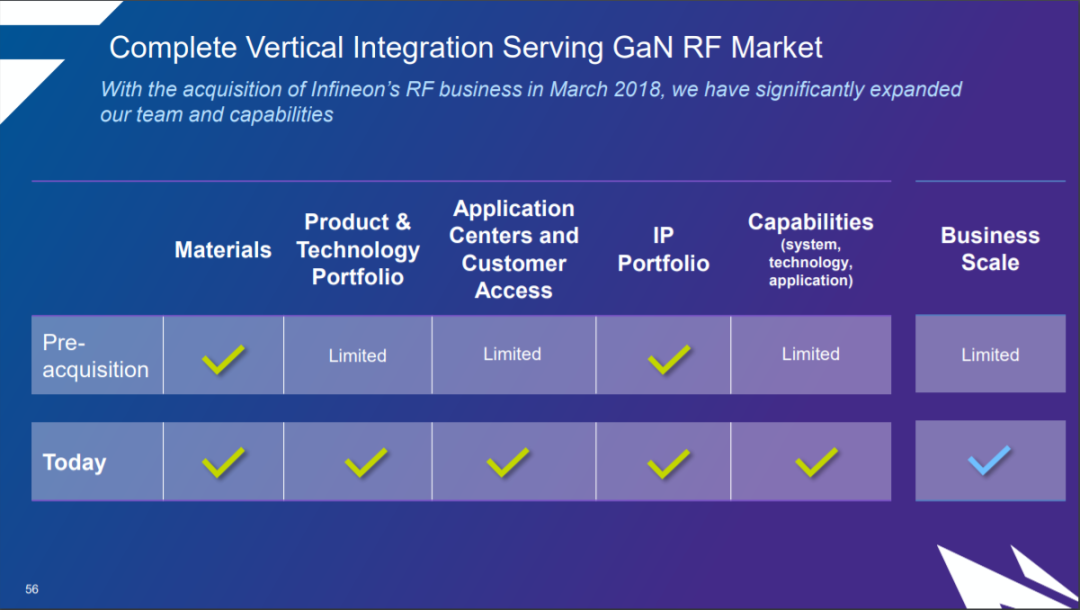 2018年,Cree以3.45亿欧元的对价将infineon的RF部门收入囊中,其中包括位于加利福尼亚州摩根希尔的LDMOS和GaN技术工厂,通过这笔收购,Cree增强了自身在射频产品和技术组合、制造能力、应用能力、市场规模和客户基础方面的短板,强化了在RF(包括硅基产品以及GaN-on-SiC)技术方面的领先地位。