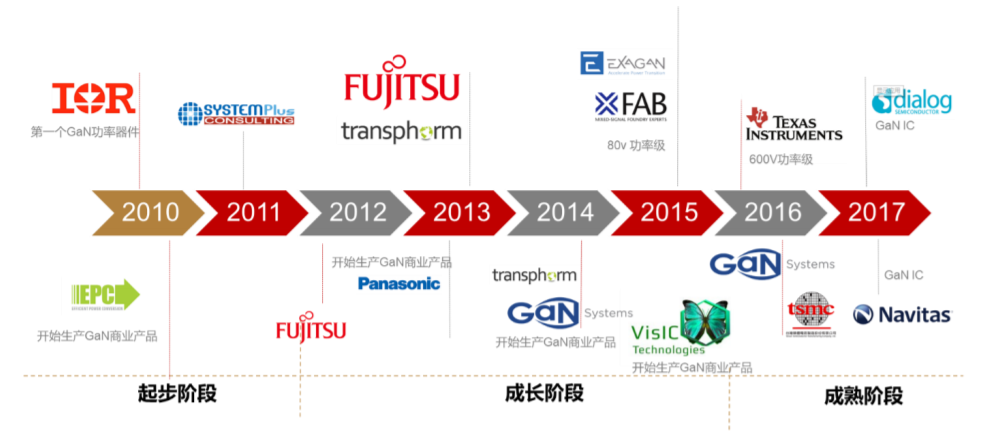 GaN在电力电子中的应用,可以从2010年IR推出第一个GaN功率器件开始算。之后不断地有公司进入,最初以IDM为主,然后逐渐有设计公司(GaN Systems,visic,navitas)、代工厂(x fab,tsmc)切入,这也意味着产业链逐渐走向成熟——当有大代工平台能够稳定地提供代工服务时,产业链上很多的节点都会被撑起来。