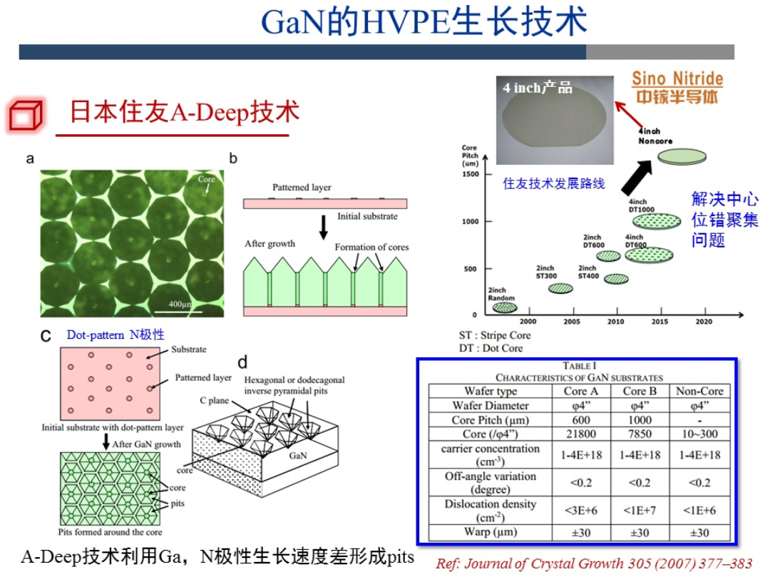 GaN作为一种半导体材料,首先面临的第一个问题是,它没有天然的本体衬底,然后其体晶生长的难度很大——GaN熔点在2300度左右,而分解点在900度左右。因此用Si单晶的方式来生长GaN是不可能的。这方面研究比较多的方法有氨热法、高压生长法等等,不过生长速率都很慢。目前应用最多的可能是氢化物气相外延(HVPE)——先在蓝宝石等衬底材料上外延生长到比较厚的尺寸,然后把衬底剥离,再抛光,得到GaN晶体。或者就是先用氨热法得到的晶体作为籽晶,然后利用HVPE的高生长速度来获得GaN晶体。这种方式得到的GaN晶体可以到比较大的尺寸,且位错密度能够比较好地控制。