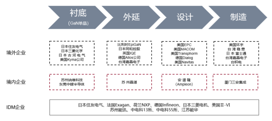 GaN自上世纪90年代进入LED领域后,现在已经是LED的主流。而整个GaN产业链的发展到如今也是比较完善了,除了国外的很多IDM公司,从上游的材料(衬底、外延)到制造和设计应用,各个环节的产业链的分工细化也已经有了相当的基础。国内国外产业链相关企业近年来都在快速地向前发展。
