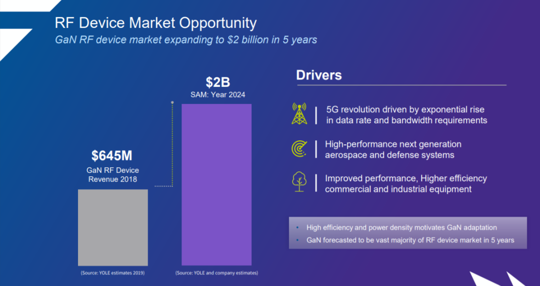 GaN在Cree业务中的应用主要在LED和RF两块,Cree的蓝光和绿光LED芯片目前都是基于GaN和其相关的材料,这部分业务已经非常成熟。在2019年Cree将其照明业务出售后,LED方面的业务就聚集在芯片上了。Cree在其远期90亿美金的pipeline计划中,基于GaN的高端LED芯片还是占据着约18%的份额。
