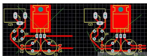 PCB 设计时,元件的布局要紧凑,要让所有的连线尽可能短,要按原理图元件功能关系去布局元件与走线。本电源图里就是先整流、再滤波、滤波后才是稳压、稳压后才是储能电容、流经电容后才给后面的电路用电。图二是上面原理图的 PCB 图,两个图相似。左图和右图就是走线有点不一样,左图的电源经整流后直接就到了稳压芯片的输入脚了,然后才是稳压电容,这里电容所起的滤波效果就差了很多,输出也有问题。右图就是比较好的图了。我们不仅要考虑正电源的流向问题,还必须考虑地回流问题,一般来说,正电源线和地回流线要尽可能同进同出,彼此离近点。