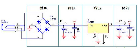从图上可知,线性电源有整流、滤波、稳压、储能等功能元件组成,同时,一般用的线性电源为串联稳压电源,输出电流等于输入电流,I1=I2+I3,I3 是参考端,电流很小,因此 I1≈I3。我们为什么要讲电流,是因为 PCB 设计时,每条线的宽度不是随便设的,是要根据原理图里元件节点间的电流大小来确定的(请百度《PCB 设计铜铂厚度、线宽和电流关系表》)。电流大小、电流流向要搞清楚,做板才恰到好处。