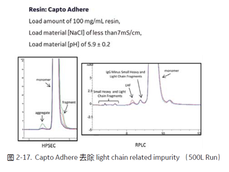 Light chain related impurity 主要产生于轻链的断裂,重链的断裂以及二硫键的断裂过程中 (图2-16)[9]。该案例中,借助 Capto Adhere 的疏水作用与氢键作用,上样量高达 100 g/L resin,在 pH 5.9 ± 0.2,电导小于 7 mS/cm 的条件下,采用流穿的方式进行层析,结果如图2-17 所示, HPSEC Fragment 含量仅为 0.1%, RPLC Fragment 含量仅为 2.5%,符合生产要求,并顺利完成 500 L 以及 2000 L Run。