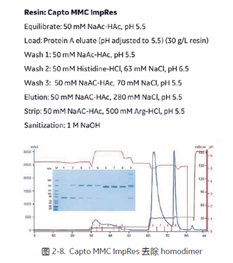 Homodimer 的去除也可以利用其与目标 BsAb 的电荷及疏水性差异,复合模式层析填料 Capto MMC ImpRes, Capto Adhere 同时具备电荷作用与疏水作用,可有效去除 homodimer[7]。案例中 pH 5.5 的上样条件下 (图2-8), homodimer 结合能力略弱于目标 BsAb,因此在 Capto MMC ImpRes 的结合洗脱的过程中加入两步淋洗步骤 Wash 2 (50 mM Histidine-HCl,63 mM NaCl, pH 6.5) 与 Wash 3 (50 mM NaAC-HAc, 70 mM NaCl, pH 5.5),从图2-9 中可明显看出 Capto MMC ImpRes 去除了大量 homodimer,但仍然残留微量的 homodimer,经过进一步的 Capto Adhere 精纯,最终将 homodimer 彻底去除。最近的研究报告中,也有发现在略低于常规 pH (比如 pH 4.5) 时 (一般抗体纯化常使用 pH 5.5), Capto MMC ImpRes 在 holehole homodimer 和 heterodimer 的分离上分辨率提高。另外,还可以通过在淋洗和洗脱 buffer 中添加 5% 的 PEG 3350 来进一步提高分辨率。