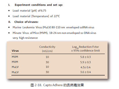 值得注意的是, Capto Adhere 取代了传统的阴离子层析,也同时保留了阴离子流穿模式病毒去除的效果, 图2-18中可以看出,即使上样 pH 高达 6.75,电导在 10~30 mS/cm 的条件下, Capto Adhere 对 MVM 的去除能力接近 6 个 log 降,对 MuLV 的去除能力也在 4 个 log 降左右。可见, Capto Adhere 依然保有强势的去病毒能力。