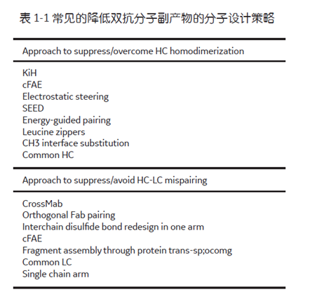 截止目前,科学家们已经找出多种巧妙的分子设计策略,来降低上述副产物的产生。表1-1[4]分别给出了可用于有效降低重链同源错配 (HC homodimerization) 以及轻链与重链错配 (HC-LC misparing) 的分子设计策略。其中,最经典的要属降低重链同源错配的 KiH,即 Knob-into-hole 技术,以及降低轻链重链错配的 CrossMab 技术。
