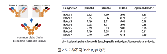 去除 homodimer,可以利用其与目标 BsAb 的电荷差异,pH梯度会比盐梯度表现出更高的分辨率。即使两种亲代抗体之间的 pI 差异非常小 (即 0.1 个 pH 单位),也可以使用高度线性的 pH 梯度分离目标 BsAb 与 homodimer[6]。图2-5 列出了 7 种不同 BsAb 的 pI 分布, BsAb#1 的两个亲代抗体 (homodimer)之间 pI 差距最大,为 1.33,相对应的 BsAb#6 和 BsAb#7 的 homodimer 之间 pI 就很小,仅为 0.1。