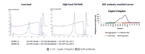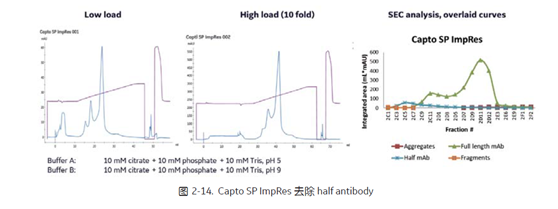 在 half antibody 的 pI 与目标 BsAb 的差异比较显著的情况下,我们也可以通过 CEX 进行纯化。图2-14 和图2-15 分别是 Capto SP ImpRes 和 Capto S ImpAct 通过 pH 线性梯度洗脱的方式分离 half antibody[8], SEC 分析结果,与 CaptoMMC ImpRes 结果相似, Capto SP ImpRes 和 Capto S ImpAct 均可以有效去除half antibody,并且达到比较高的分辨率。