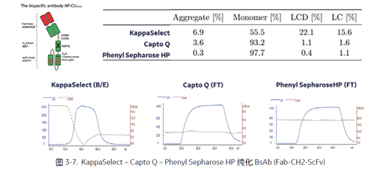 图3-7 中,对于自行构建的特殊 Non IgG-like BsAb (Fab-CH2-ScFv)[14], KappaSelect 高特异性结合其 kappa 轻链恒定区,高效捕获该 BsA b分子,后续通过 Capto Q 和 Phenyl Sepharose HP 的流穿模式,简单高效的去除了大量的 LCD, LC以及 aggregate 杂质。最终 Fab-CH2-ScFv 的 SEC 纯度高达 97.7%,满足工业生产需求。