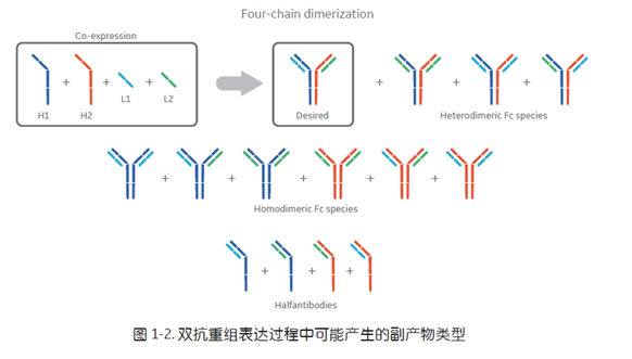 这类抗体的分子含有Fc区,因此保留了ADCC和CDC效应,可以增强肿瘤的杀伤效果,同时使双抗分子具有半衰期长,稳定性好的优势。然而,为了尽可能多的获得我们需要的分子类型,在重组表达这类双抗分子时需要进行一些分子的理性设计。图1-2[3]显示了,如果没有理性设计,在表达某双抗 (4-chain heterodimer) 时,理论上会伴随产生10种以上的副产物,主要包括重链之间错配引起的同源抗体 (homodimer Fc species),轻链与重链之间错配引起的异源抗体(heterodimeric Fc species),结构不完整的片段抗体,如半抗体 (half antibody) 或3/4 抗体,以及轻链聚集体 (light chain dimer),重链聚集体 (heavy chain dimer) 等等。