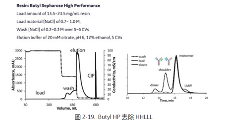 对于极其难以去除的 HHLLL (完整 BsAb 上多了一条轻链),也可以在高分辨率的疏水性较弱的 Butyl Sepharose HighPerformance 上采用结合洗脱的模式进行有效去除 (图2-19)[10]。最终纯度可达 98.2 ± 0.3% ,同时收率在 80% 左右。