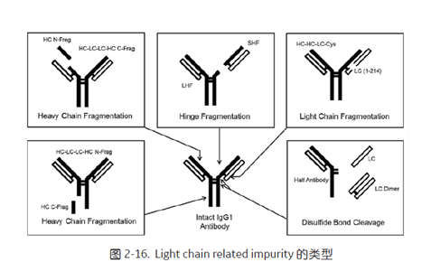 Light chain related impurity 主要是 BsAb 生产中的出现的一些分子片段,其中 HHL (完整 BsAb 上缺了一条轻链) 和HHLLL (完整 BsAb 上多了一条轻链) 为最难去除的片段杂质。但是即使是与目标 BsAb 差别很小的 HHL 与 HHLLL,通过电荷或/及疏水性差异也可以将其有效去除。