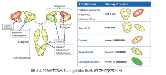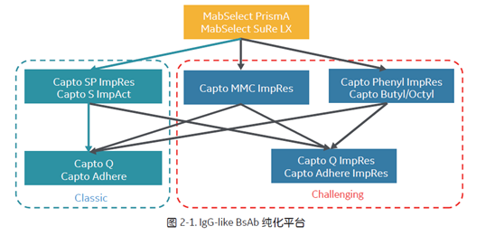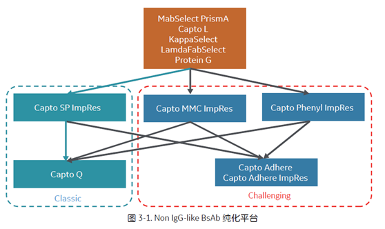 Non IgG-like BsAb 纯化的成功案例有很多,不乏成功应用 MabSelect PrismA, Capto L, KappaSelect, LambdaFab Select 等进行捕获的工业级别案例,同时精纯步骤,高分辨率的阳离子与多模式复合填料也都得到了广泛应用。