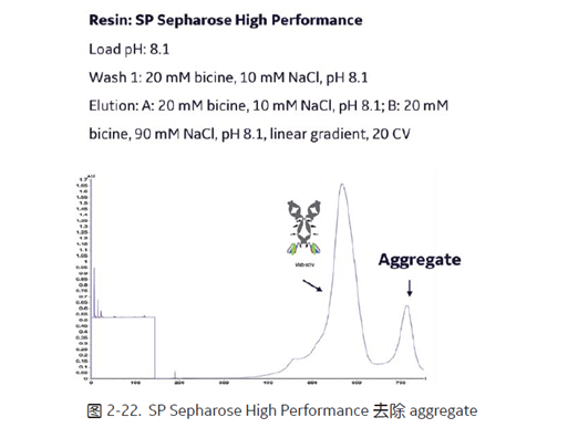 CEX,在碱性 pH 条件下,可以提高对 aggregate 的分辨率 (图2-22)。案例中目标分子为 Mab-ScFv,上样 pH 为8.1,接近目标 BsAb 的 pI,采用结合洗脱的方式,通过在 SP Sepharose High Performance 上进行盐线性梯度洗脱,使得最终SEC 纯度高达 99.3%,收率也近 70%[12],不仅有效去除了 aggregate,同时还除去了杂质 Mab-diabody。