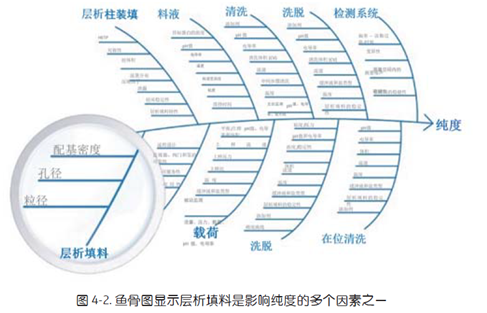 在鱼骨图中 (图4-2),尽管已经分析出填料的批次差异对于工艺的影响是较为显著的,但是无法真正进入 DoE 的实验,客户常用的方式就是随机选择三批次的填料进行稳健性测试,但是这种做法局限性是非常明显的。局限性表现在三个方面:a 如果没有观察到不同批次的变异,不代表没有影响,可能选择的批次配基密度太类似,而时间关系很难能拿到靠近极端范围的填料批次。b 如果观察到变异,但是无法量化,趋势未知,从而不能指导工艺范围的调整及优化。c 对于变异的引起是来源于填料批次还是其他问题,并不能清楚,很可能有噪音干扰,从而导致这种测试仅仅起到有限的参考作用。