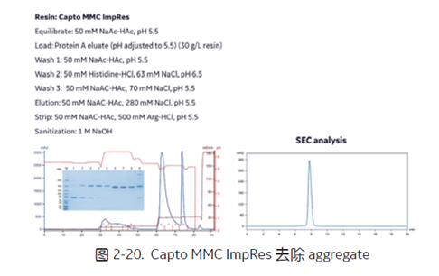 Capto MMC ImpRes 具有更细的粒径和更低的配基密度,从而可以提高单体和聚集体的分辨率。该填料在 pH 5.0-7.0、 0-150 mM NaCl 之间可以保证比较高的结合载量,在 pH 5.0 条件下,获得的纯度最高。通过盐洗脱的方式可以有效去除 aggregate,但是洗脱峰拖尾比较严重,可能是因为疏水作用力在起作用,此时可以用过添加精氨酸 arginine(破坏电荷相互作用和疏水相互作用) 的方式,在保障分辨率的前提下缩小洗脱体积。在图2-20 案例中,采用 50 mM NaAc-HAc, 500 mM Arg-HCl, pH 5.5 的 strip 条件,高效去除了 aggregate,经 HPLC 分析之后, SEC 纯度从 73.3% 提高到了99.0%[7]。