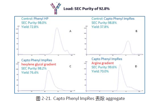 疏水层析技术在 aggregate 去除的应用上非常有效。一般情况下, HIC 可以使 BsAb monomer 通过 FT 模式实现与聚集体的分离。聚集体的疏水性比单体要强,对于自身疏水性比较强的 BsAb 分子, Capto Octyl, Capto Butyl 等疏水性比较弱的可以作为优先选择,通过筛选一个合适的上样条件,就可以使目标 BsAb 分布在流穿组分中, aggregate 结合在填料上,从而实现有效分离。当然,也可以选用 Capto Phenyl ImpRes 或 Phenyl HP 这样高分辨率的疏水层析填料,通过结合洗脱的方式,高效去除 aggregate,纯度都可达 98% 以上,同时可以通过添加乙二醇或精氨酸的方式提高收率 (图2-21)[11]