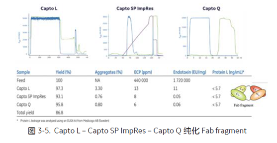 图3-5 中, Capto L 高效捕获含有 kappa 轻链的可变区的 Fab 片段,一步亲和收率高达 97.3%,经阳离子层析Capto SP ImpRes 和阴离子层析 Capto Q 之后, Fab 纯度高达 99.2%,同时 total 收率高达 86.8%。