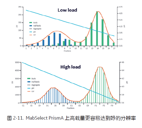 Half antibody 只含有一个 Fc 区域,因此它结合 Protein A 填料的能力比含有两个 Fc 的分子较弱一些。在 protein A亲和层析阶段进行 pH 线性梯度洗脱, half antibody 将会比目标物略早洗脱。图2-10 中, MabSelect PrismA 通过 pH 线性梯度洗脱的方式,将 half antibody 与目标 BsAb 显著分离,同时还可以去除一些其他杂质[8]。一般情况下,经 MabSelect PrismA 这一步后,保持收率在 85% 的前提下,纯度仍然可达 90% 以上。同时研究表明,在 MabSelect PrismA 亲和层析中,上样载量越高, half antibody 与目标 BsAb 分离效果越好,即高载量更容易获得更高的分辨率 (图2-11)