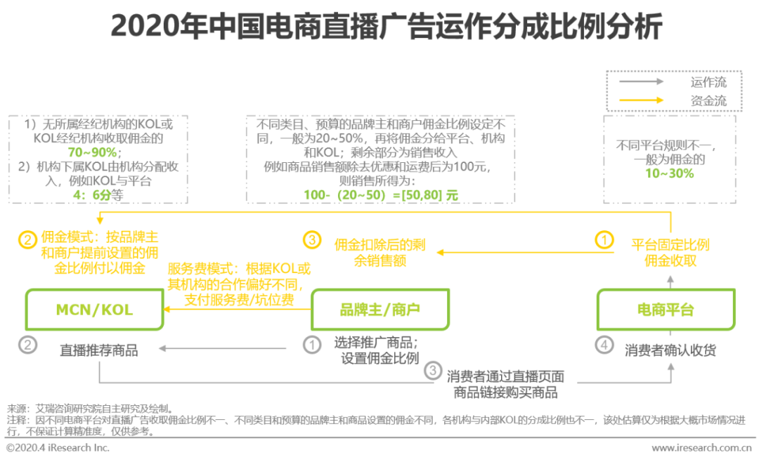 电商直播广告的运作和收费模式与电商导购营销基本类似,只是相对于简单直接的导购方合作模式,直播方的合作和收费模式稍显复杂。从合作收费模式来看,开展直播广告的品牌主和商户可以与KOL以纯CPS佣金、纯服务费或佣金加服务费的模式进行合作;电商平台和导购方一起按比例分给定的佣金,而非电商额外收固定比例的佣金。从分成模式看,若KOL无所属经纪机构代理,则直接获得服务费或/和佣金;若KOL有经纪机构代理,则按内部标准再次对直播带货所得进行分成。
