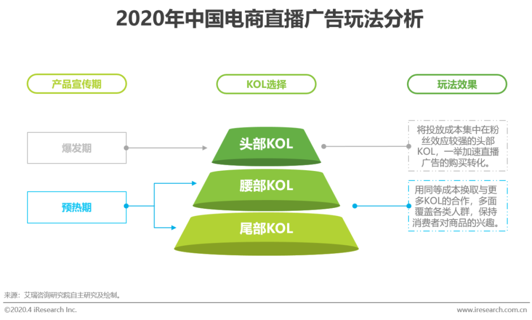 电商直播广告的组成核心除了商品定制化直播内容设计外,就是对直播者的选择,尤其是对不同粉丝量和影响力KOL的选择。腰部和尾部KOL粉丝量相对头部来说较少,对消费者的触达更为聚焦和集中,但这也增加了该类KOL与消费者间的沟通,使KOL形象更为真实。在产品预热期间,扩大与腰尾部KOL的合作能够更为细致地触达更多消费者,保持消费者对商品的兴趣。而头部KOL粉丝基础扎实、影响力大、消费者覆盖面广,在产品爆发期更能够一举将产品优惠和宣传信息推广给更多消费者,集中提升商品销量。
