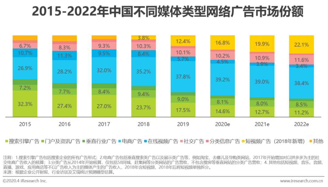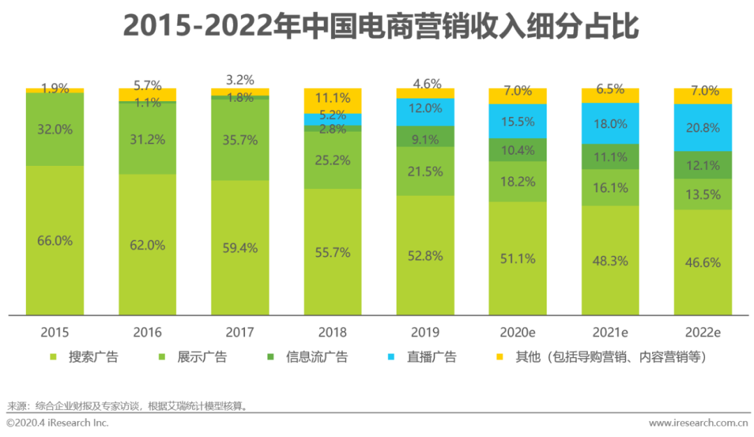 因适配于电商平台“搜索-点击选择-购买”链条的天然属性,搜索广告在电商营销细分构成中占比最大,2015-2019年间维持着50-70%的份额贡献度,展示广告以30%左右的占比紧随其后。2018年起,电商平台的信息流广告得到进一步发展,直播广告出现并迅速实现市场份额增长,展示广告受到较大冲击,占比被大幅压缩,而搜索广告因ROI较高更为刚需,受到的影响较小。未来,随着各个电商平台内容布局的加强与直播广告带货效果的凸显,内容社区信息流广告和直播广告持续蚕食电商营销市场份额的态势预计还将持续。