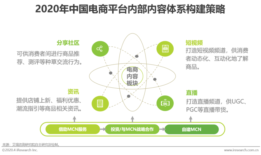 预期在未来的发展中,为跟从内容化趋势,电商平台将进一步强化自身内容板块的建设,通过分享社区、短视频、直播、资讯等内容模式,更牢固地绑定消费者。在内容传播流程中,因具有粉丝效应的KOL占据重要地位,电商平台和MCN机构的合作关系进而可随内容化建设的加深而逐步强化,从单纯为了品牌主和商户的需求而借助MCN的服务、到进一步投资或与MCN达成战略性合作、再到自建MCN,将MCN的运作内化,最大化提升为品牌主和商户定制化产出营销内容的效率。
