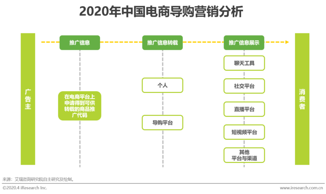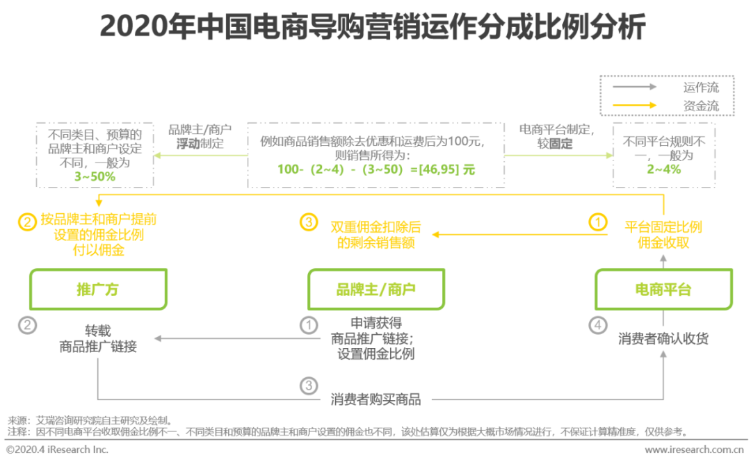 因在消费者购买消费并确认收货后才扣除佣金作为投放成本支出,导购营销的投放回报被完美保障。具体到收取佣金的对象,推广方和品牌主/商户卖出商品所在电商平台都会因导购营销方式达成的交易而获得佣金,其中,电商平台的佣金抽成比例相对较低且对于不同商品收取的佣金比例相对固定;而对于个人或平台推广方而言,则依照品牌主/商户自行制定的抽成比例获得佣金;品牌主和商户最终获得电商平台扣除两方佣金后的销售所得。