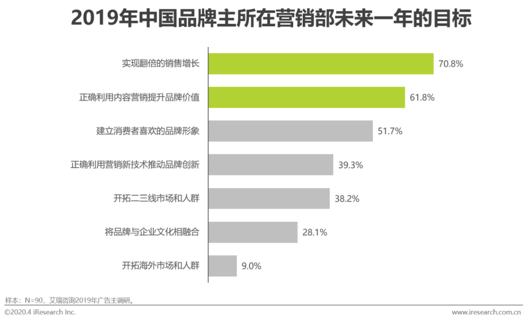 在艾瑞2019年对广告主的调研中,广告主们最关注的营销目标为实现翻倍的销售增长和正确利用内容营销提升品牌价值,品效并重的营销需求愈发强。相较于其他类型媒体平台,电商平台除了拥有相同的媒体属性外,还具有消费属性,使得平台上的营销投放拥有快速转化为实际消费的基础;同时,电商平台的营销类型从搜索、展示为主的局面,逐渐扩展出由图文、短视频、直播构成的信息流、直播广告等多元营销模式,内容化程度不断加深,帮助广告主实现品效合一的营销需求。