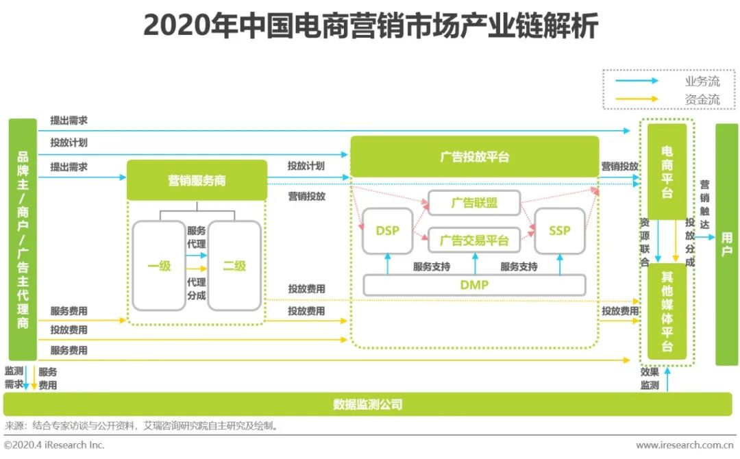 广告主代理商、营销服务商、广告投放平台和电商及其他媒体平台在品牌主/商户和消费者之间构建起了最核心的电商营销产业链条部分,品牌主和商户可以通过直接与电商平台建立起联系来实现对消费者的触达,也可以依照自身需求,将营销执行不同程度地外包,选择借助营销链条中的代理商、服务商或投放平台的服务来完成营销投放。同时,电商品牌会与其他媒体平台达成合作,以触达站外流量。在营销投放行为完成后,品牌主和商户将会借助第三方的数据监测公司对营销投放效果进行监测与核实,确认费用与效果的匹配度。