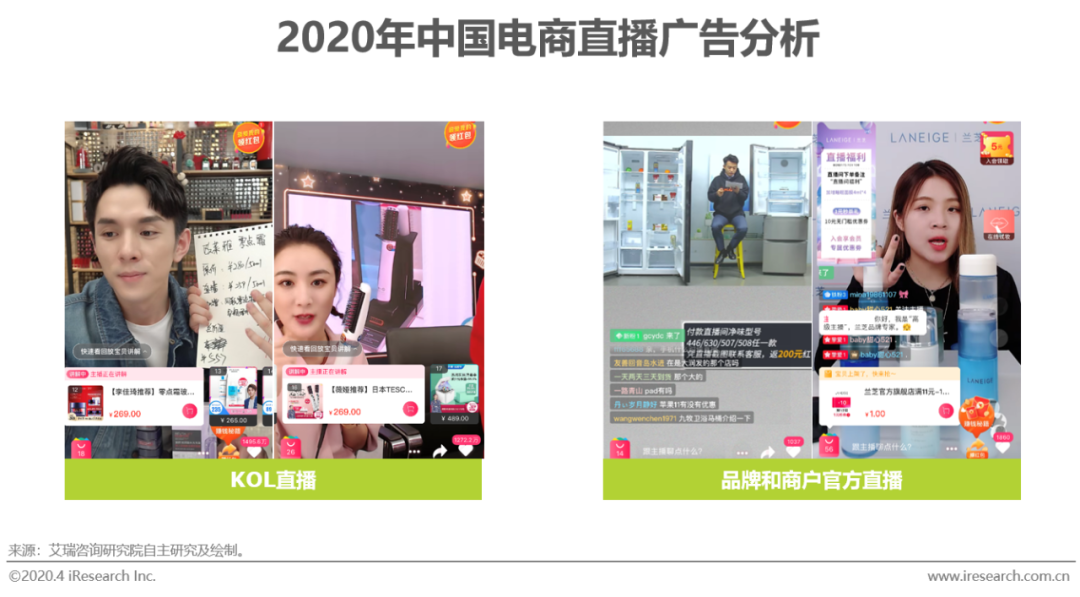 依托电商直播频道而形成的电商直播广告,其最主流的形式有两种:一是品牌主和商户与人气KOL合作直播,利用KOL的粉丝效应促进商品销量的提升;二是品牌主和商户员工作为品牌专家上阵宣传,主打对产品的了解深度和专业度,通过加强消费者对商品推广信息的信任来拉动产品销售。一般在开展电商直播广告时,品牌主和商家都会为直播中的商品提供限时优惠,并在直播界面上设置商品跳转链接,激发消费者的购买欲并缩减“种草”到“拔草”间的时间,在直播期间高效提升产品销售量。