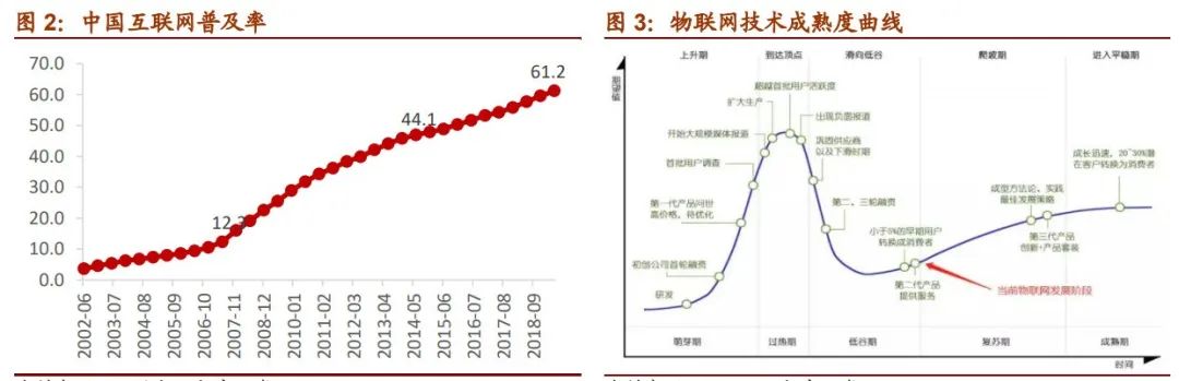 从技术成熟度曲线来看,物联网行业已逐步从低谷期迈向复苏期,随着物联网设备成本的大幅下降,加上AI和大数据等辅助技术加持,物联网真正能够对下游客户产生降本增效的作用。未来物联网有望复制互联网时代的光辉,产生新一代的物联网领军企业。