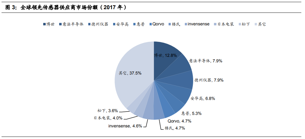 目前,传感器的主要供应商还是海外巨头,如下所示,排名前十的传感器公司,全部是海外公司,其把持着高端传感器市场,而国内公司正从个别传感器领域不断突破,进去细分领域前列,总体来看,国产替代空间巨大。