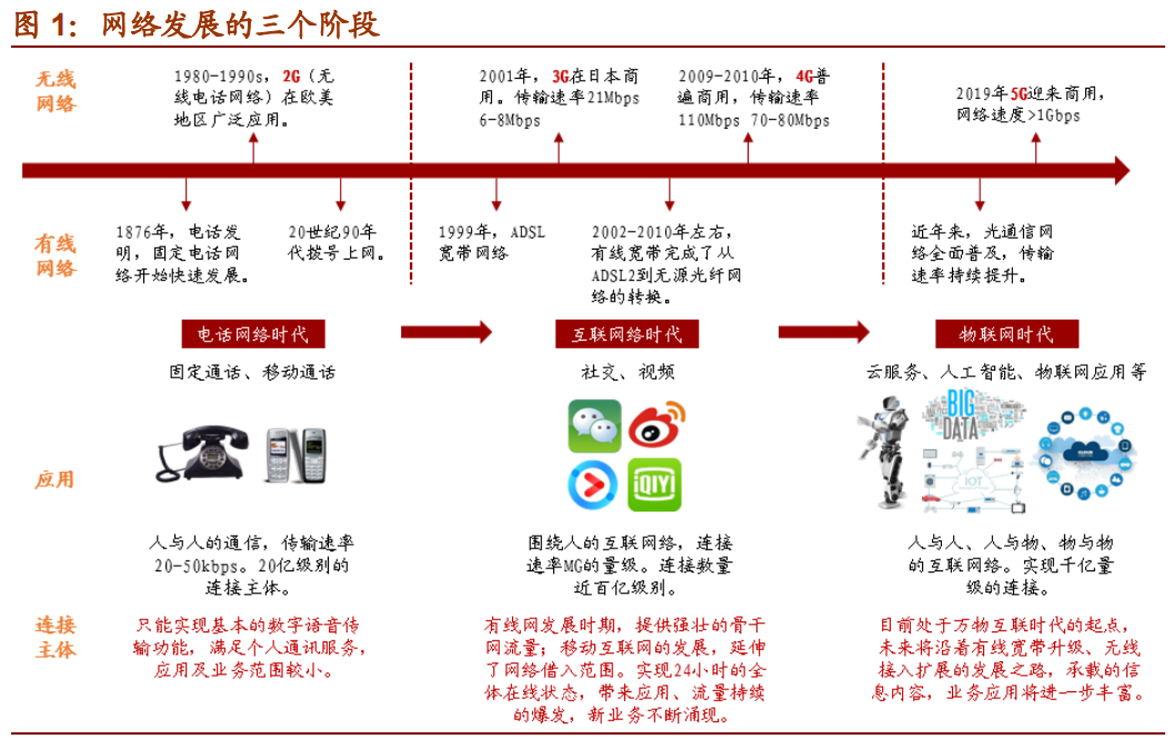 网络发展可分为三个阶段,电话网络时代、互联网络时代、以及即将进入的物联网络时代。