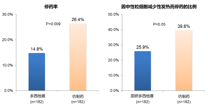 加拿大的一项回顾性调查⁽¹⁷⁾纳入400例乳腺癌患者,分别接受原研多西他赛注射液(n=200)和多西他赛仿制品(n=200)治疗。结果显示,与仿制药组相比,原研药组发生Ⅳ级发热型中性粒细胞减少(56.3% vs. 78.8%)、中止化疗(14.8% vs. 26.4%)、使用粒细胞集落刺激因子(G-CSF)(28.8% vs. 44.5%)的患者比例更低;仿制药组患者还延长了住院治疗时间、增加了G-CSF的费用。从该研究结果可以看出,在加拿大使用仿制多西他赛不仅安全性更低也不能节约治疗成本。