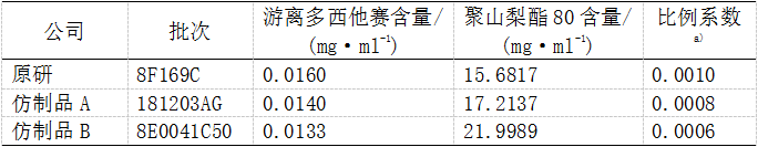 注: a) 比例系数=游离多西他赛含量 (mg/ml)/ 聚山梨酯80含量 (mg/ml)