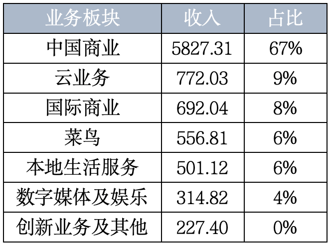 从阿里角度来看,在截至3月31日的2023财年,集团8686.87亿总收入中,除中国商业版块高达67%的营收占比外,其余版块收入贡献依次为云业务(9%)、国际商业(8%)、菜鸟(6%)、本地生活服务(6%),以及数字娱乐(4%)和创新业务(0%)。